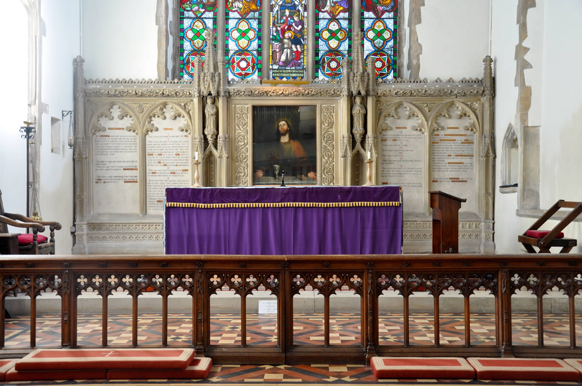 THE CHANCEL AND THE ALTAR Behind the altar set in the centre of an 18th century reredos is a painting of Christ by Constable. The east window is believed to have been designed and painted by George Mayer (1822-1884) and erected by Tomas Baillie & Co., London. To the right of the altar is a heavily cupped piscina. On the opposite side four steps lead up to the vestry door. Note the headstops on the hood mould boast luxuriant moustaches! Further along a tabernacle for the Blessed Sacraments is set within what was originally a ‘squint’ proving that the vestry beyond was once a chapel.